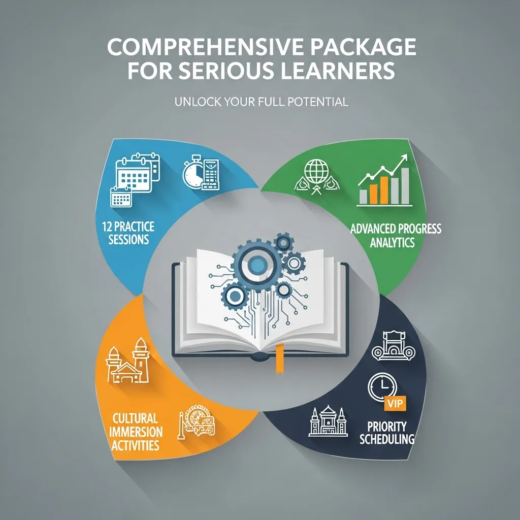 Comprehensive package for serious learners. Features 12 practice sessions, advanced progress analytics, cultural immersion activities, and priority scheduling.